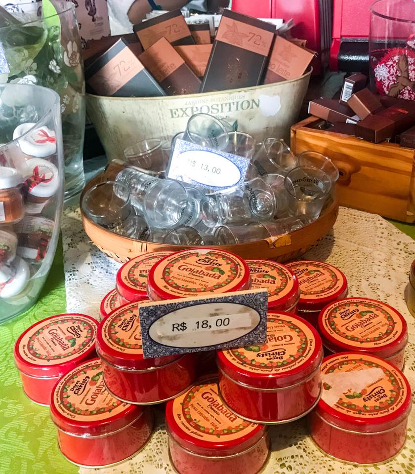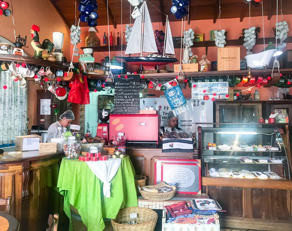 Também em Ribeirão da Ilha, em frente ao Ostradamus, está o café Tens Tempo, inaugurado em 2010 pelo proprietário do restaurante. Visitei o Tens Tempo para saborear seus doces portugueses em 2015 e em 2018 – definitivamente o cafezinho e a sobremesa valem mais a pena ali. O local com decoração tão impecável quanto a do Ostradamus é um misto de café, doçaria e loja de presentes. Olhe a tentação da vitrine de doces (é claro que eu pedi mais de um):
