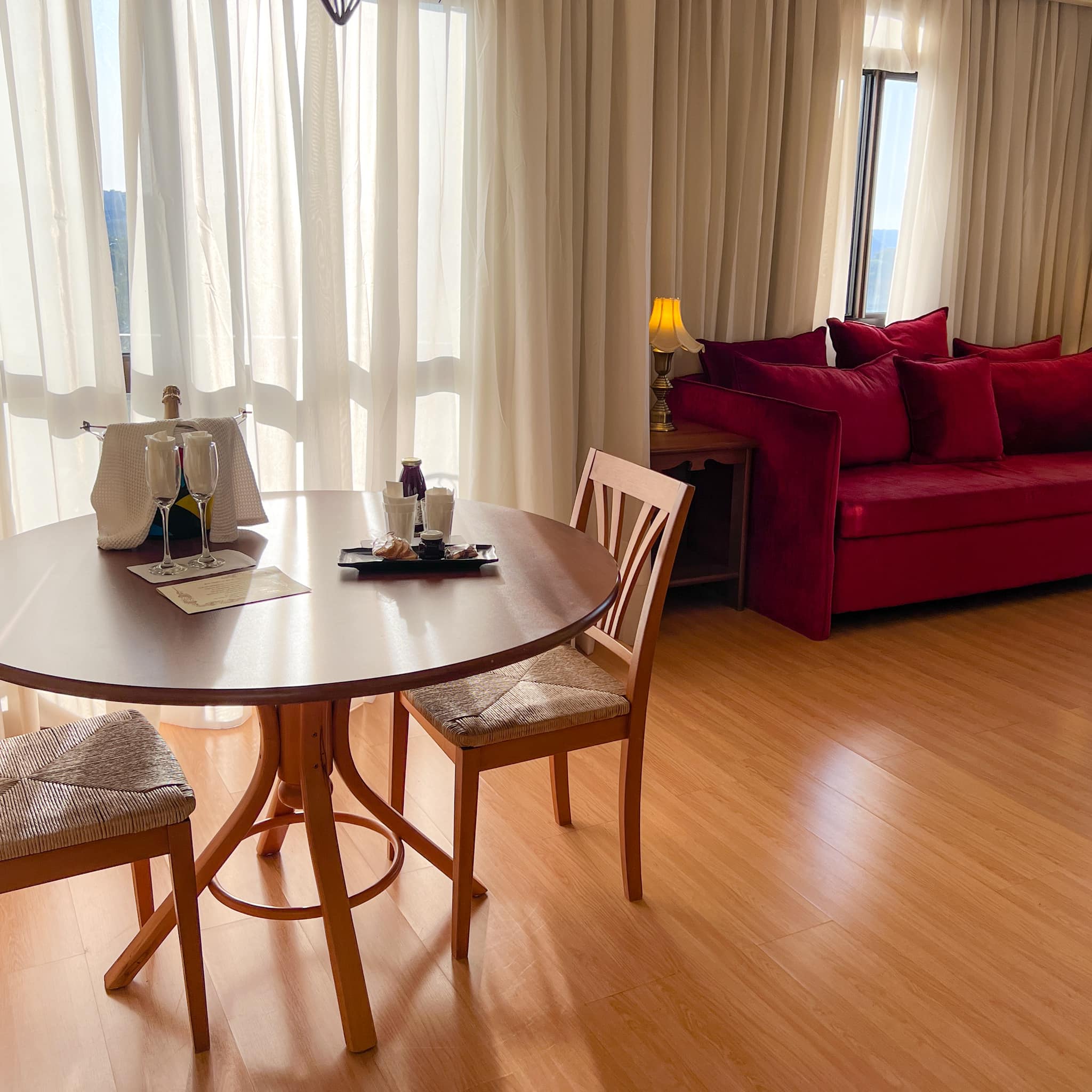 Além da vista panorâmica dos vinhedos, nossa suíte, a Regia Nova Safra, tinha sala de jantar, lareira a gás, cama king size e uma chaise longue, que pode acomodar uma terceira pessoa.