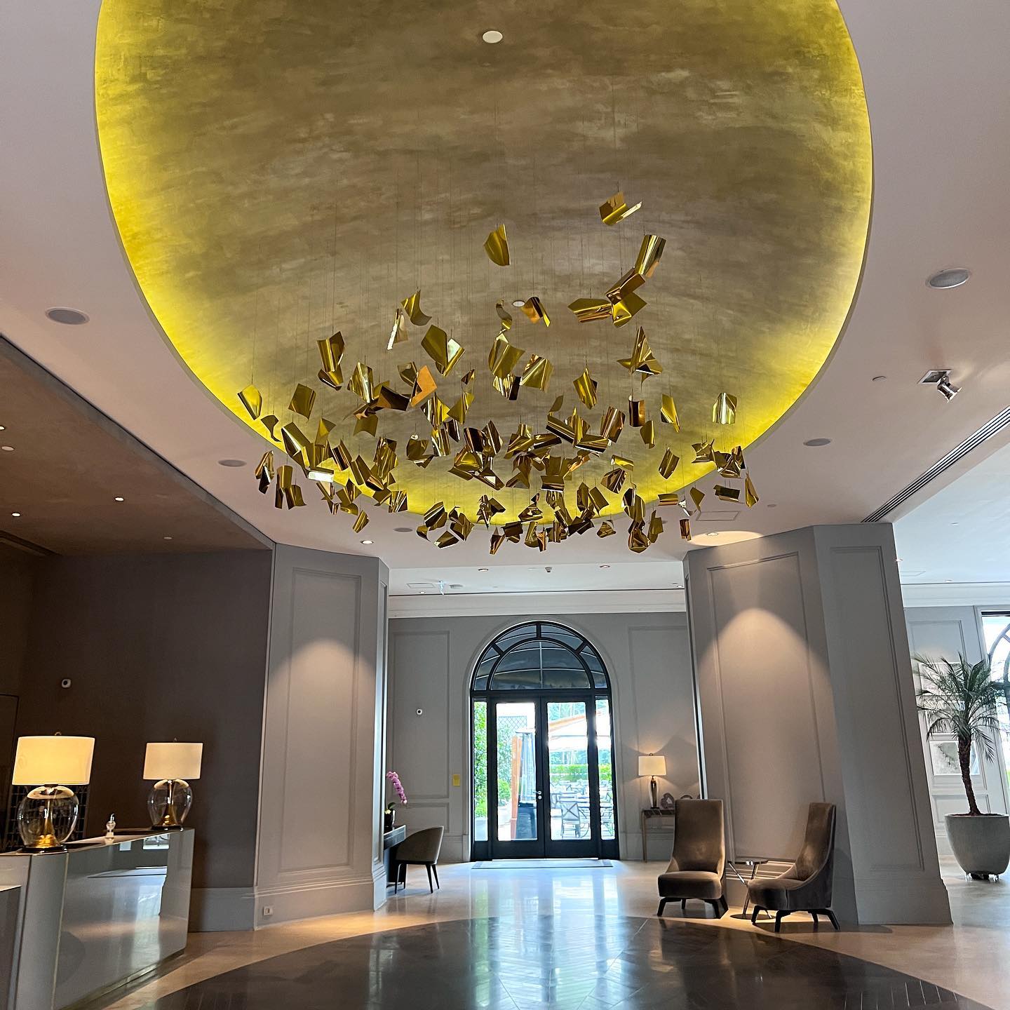 Na recepção, um recorte côncavo no teto criou um tipo de domus que abriga o trabalho da artista brasileira Laura Vinci, intitulado Lux Capela. Feito de folhas de ouro, o elemento decorativo lembra, de um jeito moderno, o período do Brasil colonial. Grandes janelas também evocam as estruturas do período colonial.