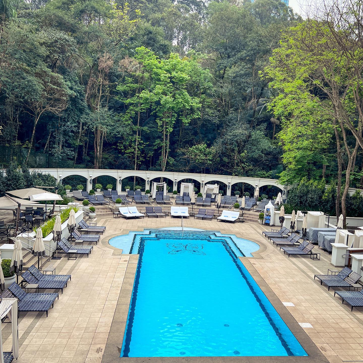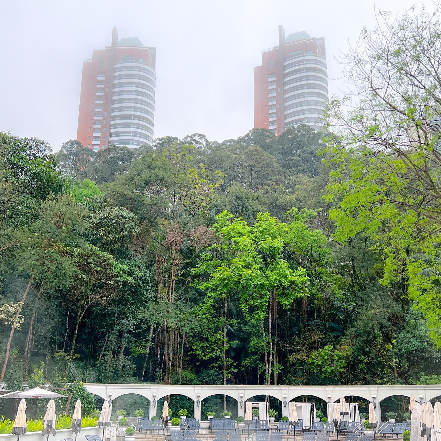 A piscina interna é parte do projeto original dos anos 40 e é obra do arquiteto Oscar Niemeyer, o mesmo responsável pela arquitetura de Brasília, onde residimos. Já a piscina externa proporciona a vista dos sofisticados prédios residenciais no bairro Panamby e do parque Burle Marx. E quando estive, em setembro, ainda estava frio e os dias eram acinzentados, chuvosos e com muita serração, o que torna o clima ainda mais especial para mim.