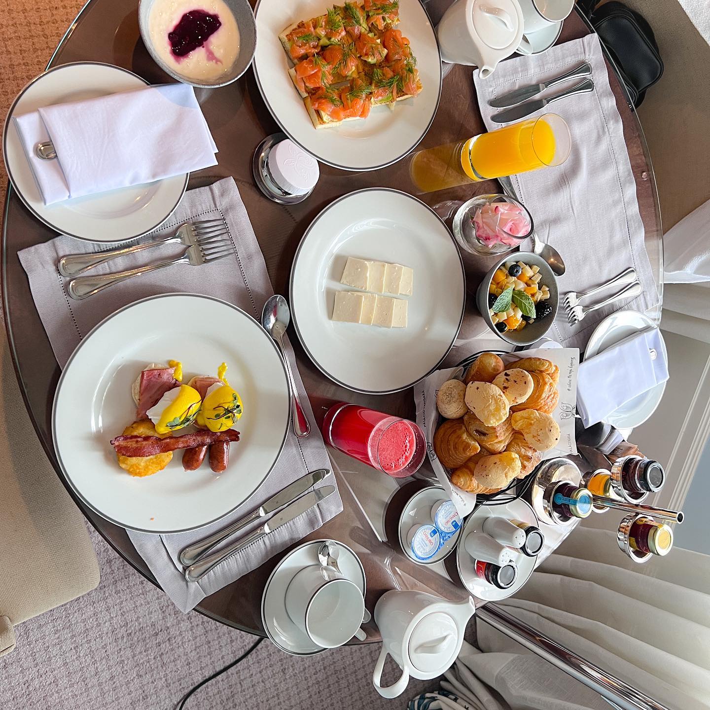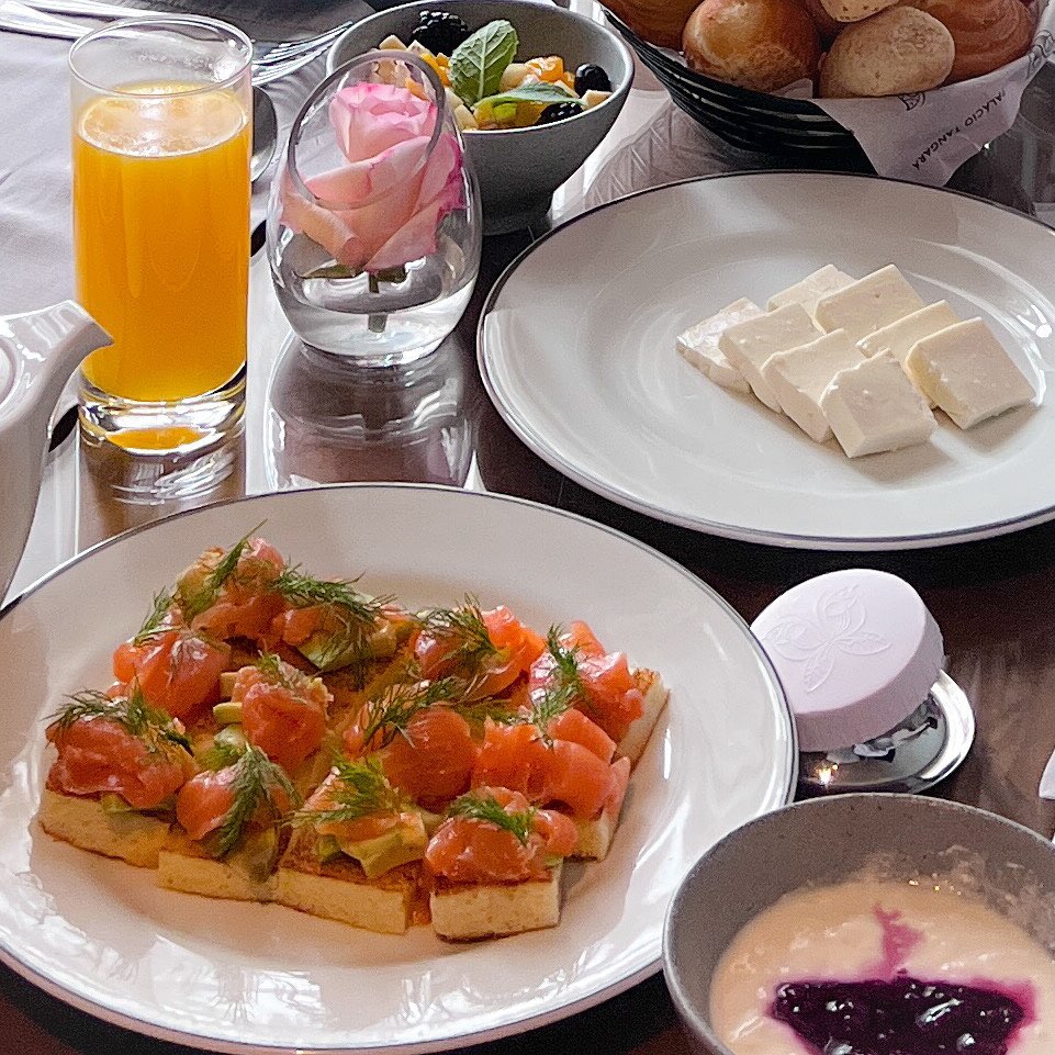 O café da manhã é servido à la carte. Consiste em uma seleção de pães, frios, geleias, sucos e frutas, além de opções de pratos quentes como tapiocas, ovos Benedict e sanduíches de salmão, por exemplo. É possível também pedir o dejejum no quarto, desde que você preencha um formulário na noite anterior com os itens a sua escolha. Aqui fotos do meu café da manhã em três versões: buffet, no quarto e à la carte (mingau de banana e açaí com granola e banana).